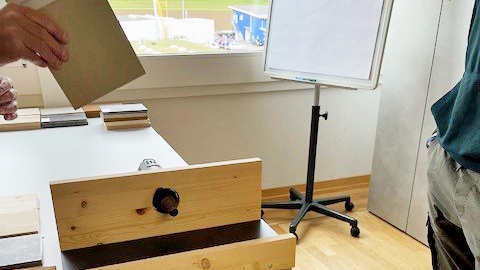 Der zweite Tag begann um 8 Uhr an unserem Standort in Niederbipp. Uns wurden von verschiedenen Mitarbeitenden die unterschiedlichsten Holzwerkstoffe mit ihren Brennpunkten und ihrer Belastbarkeit erklärt. Wir durften hierzu auch Tests machen und teilten uns in Gruppen auf. Unsere Vermutungen, wie die Tests ausfallen werden, haben wir als Gruppe besprochen und aufgeschrieben. Bei einem Posten mussten wir mit einem Föhn die Materialien 30 Sekunden lang erhitzen und danach mit einem Infrarot-Thermometer messen, welches Material am heissesten wird. Die Materialien, die wir erhitzten, waren Metall, Eiche, Buche und eine Faserplatte. Am Anfang dachten alle, dass das Metall am heissesten werden würde. Doch schnell stellte sich das Gegenteil heraus. Das Metall wurde knapp 27 Grad heiss und die Faserplatte knapp 280 Grad. Am Schluss wurde der jeweils letzte Posten den anderen Gruppen vorgestellt und erklärt. Um die Mittagszeit gingen wir in der nahe gelegenen Kantine essen.